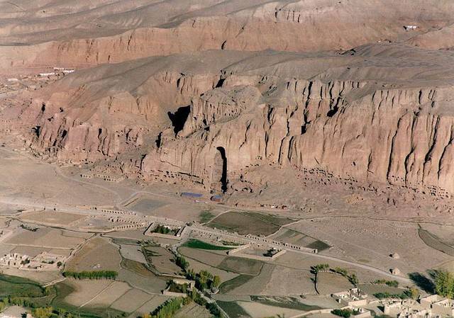 巴米扬佛像群位于阿富汗首都喀布尔西北的巴米扬镇东北郊不远的山崖处。这里遍布大小石窟6000余座,石窟群中有6尊傍山而凿的佛像。