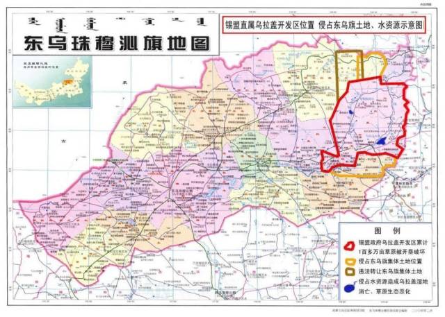 乌拉盖地处内蒙古锡林郭勒盟、兴安盟、通辽市三地接壤处,草原深处地广人稀。长期以来,兴安盟、通辽市的农牧民不断进入本属锡盟管辖的乌拉盖地区开地、放牧,锡盟方面也不肯相让,于是这块生态“宝地”成了大家争相进入的开发热土。据乌拉盖开发区管委会有关人员介绍,经年累月的越界开垦和放牧蚕食了乌拉盖大片土地,而且一次次在重新划界中合法化,最有说服力的证明是,原本属乌拉盖地区的一个农场场部竟然“跑”到了锡盟外。